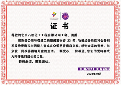近日,北京石油化工工程有限公司收到中華少年兒童慈善救助基金會(huì)眾愛專項(xiàng)基金捐贈(zèng)證書。感謝公司在"金秋助學(xué)"活動(dòng)中為困難兒童慷慨解囊做出的善舉。