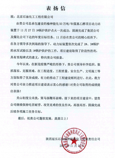 近日,延長石油榆神能化公司發(fā)來表揚信,對北京石油化工工程有限公司總承包的50萬噸/年煤基乙醇項目動力站裝置1號鍋爐烘爐點火一次成功表示祝賀和感謝。據(jù)悉,1號鍋爐于11月27日低溫烘爐點火成功,該鍋爐生產(chǎn)蒸汽能力達(dá)286噸/小時。目前,動力站3臺鍋爐試壓工作已圓滿完成,為項目中交奠定了堅實基礎(chǔ)。