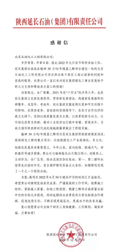 在北京石油化工工程有限公司總承包的延長石油榆神能化50萬噸/年煤基乙醇項(xiàng)目緊鑼密鼓、加快建設(shè)的關(guān)鍵時(shí)期,12月29日,陜西延長石油(集團(tuán))有限責(zé)任公司向我公司發(fā)來感謝信,對我公司2021年乙醇項(xiàng)目建設(shè)工作給予了充分肯定和高度評價(jià)。