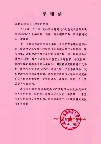 項(xiàng)目建設(shè)期間,面對(duì)工期緊張、場(chǎng)地狹窄、設(shè)備吊裝困難等諸多不利因素,項(xiàng)目組全體人員,精心策劃,合理安排施工計(jì)劃,緊盯節(jié)點(diǎn)目標(biāo),有效推進(jìn)了項(xiàng)目建設(shè)進(jìn)度,提前一個(gè)月完成所有項(xiàng)目計(jì)劃。為此,陜西未來能源化工有限公司發(fā)來感謝信,對(duì)我公司在項(xiàng)目建設(shè)中付出的努力表示感謝,對(duì)項(xiàng)目試車成功表示祝賀!
