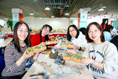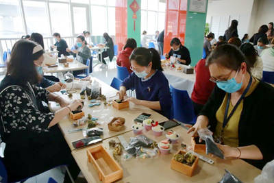 在下午開展的手工制作微景觀植物活動(dòng)中,讓女職工顯露出動(dòng)手的天賦。工作人員事先準(zhǔn)備了制作微景觀多肉植物的相關(guān)材料,如玻璃瓶、木盒、繁殖土、鋪面石、裝飾砂石、擺件等,大家將不同種類的多肉植物搭配在一起,填土、配色、種植、鋪面,不一會(huì),一盆盆精美的盆栽爭(zhēng)奇斗艷,大家分享經(jīng)驗(yàn),交流養(yǎng)護(hù)心得,釋放了壓力,舒緩了心情。