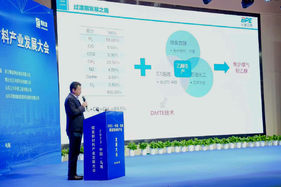 北油工程副總經(jīng)理劉戈作為嘉賓以“從傳統(tǒng)焦化邁向新能源”為主題展開演講。目前煤化工產(chǎn)業(yè)的整體發(fā)展主要集中在甲醇、乙二醇等傳統(tǒng)領(lǐng)域,有發(fā)展煤基乙醇的潛在優(yōu)勢。劉戈提出,煤化工高質(zhì)量發(fā)展之路,要以焦?fàn)t尾氣制乙醇為媒介生產(chǎn)乙烯、醋酸乙烯、EVA、走向光伏領(lǐng)域,環(huán)氧乙烷、碳酸酯電池電解液,進(jìn)入電池新能源行業(yè)。