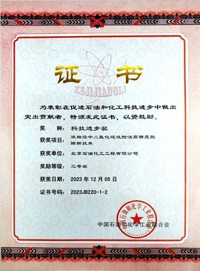 近日,中國石油和化學(xué)工業(yè)聯(lián)合會(huì)公示了《2023年度科學(xué)技術(shù)獎(jiǎng)》獲獎(jiǎng)成果,北京石油化工工程有限公司“液相烴中二氧化硫吸附法高精度脫除新技術(shù)”榮獲2023年度中國石油和化學(xué)工業(yè)聯(lián)合會(huì)科技進(jìn)步獎(jiǎng)三等獎(jiǎng)。