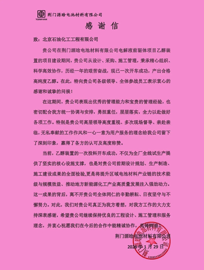 1月26日,北京石油化工工程有限公司(簡稱:北油工程)總承包的荊門源晗乙醇裝置一次性開車成功,順利產(chǎn)出合格高純度乙醇,標(biāo)志著該項(xiàng)目建設(shè)任務(wù)圓滿收官、實(shí)現(xiàn)階段性重大突破。荊門源晗特向北油工程發(fā)來感謝信,對公司各級領(lǐng)導(dǎo)及項(xiàng)目團(tuán)隊(duì)在裝置建設(shè)期間的傾力支持、卓越管理和辛勤付出,致以衷心感謝與誠摯問候。