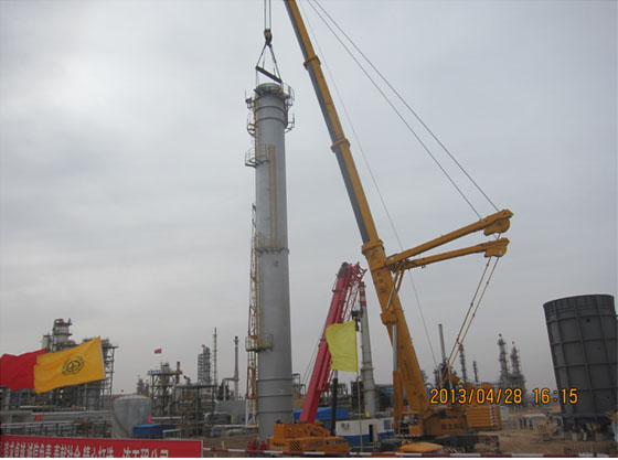 2013年4月28日早晨,隨著吊車發(fā)動機隆隆的聲響,100項目(煤-油共煉試驗示范項目)現(xiàn)場第一吊--煙囪吊裝開始作業(yè),這標志著100項目進入了設備安裝階段。