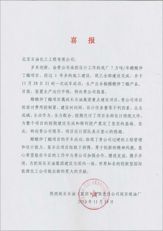 由我公司設(shè)計(jì)的陜西延長(zhǎng)石油(集團(tuán))有限責(zé)任公司延安煉油廠7萬(wàn)噸/年醋酸仲丁酯項(xiàng)目,經(jīng)過(guò)近1年的設(shè)計(jì)、采購(gòu)和施工建設(shè),整個(gè)工程已全部建設(shè)完成,2013年11月28日一次試車(chē)成功,生產(chǎn)出合格的醋酸仲丁酯產(chǎn)品,目前各裝置生產(chǎn)運(yùn)行平穩(wěn)。為此,業(yè)主單位特向我公司發(fā)來(lái)喜報(bào)。